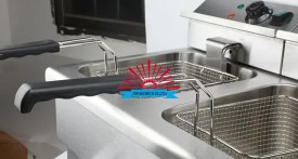 • Cơ chế chiên của loại bếp ăn công nghiệp này là bạn sẽ cho đồ cần chiên qua một chiếc rá có tay cầm. Chiếc rá này được thiết kế để vừa vặn với nồi chiên. Khi chiên, bạn sẽ không trực tiếp cho đồ ăn xuống nồi chiên đang sôi ùng ục mỡ mà cho vào chiếc rá rồi để chiếc ra đó vào nồi chiên. Như vậy, đồ cần chiên sẽ không bị sát xuống đáy nồi chiên mà được treo lơ lửng trong lòng nồi bởi đã có rá nồi đỡ. Món ăn khi chín sẽ tự khắc nổi lên. Bạn chỉ việc nhắc chiếc rá ra, cho đồ ăn vào giấy thấm dầu chứ không cần dùng đến đũa để gắp đồ ăn ra ngoài.